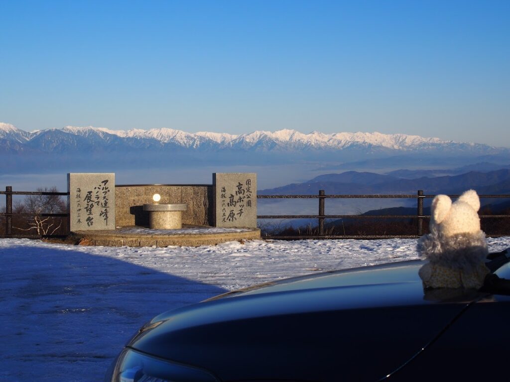 まだ夜の気配が残る高ボッチ高原。足もとの諏訪湖は、いつのまにか雲の海にのみこまれていた。そのむこうで、朝が生まれる瞬間を、うさブタは息をひそめて見つめていたよ。